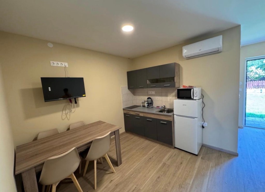 - Teljesen felszerelt konyha (tűzhely, hűtő, mikró, edények)
